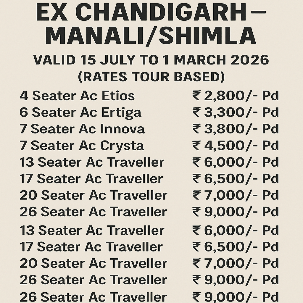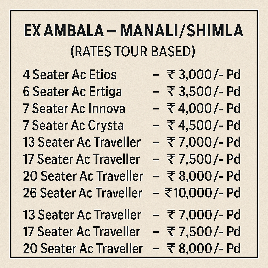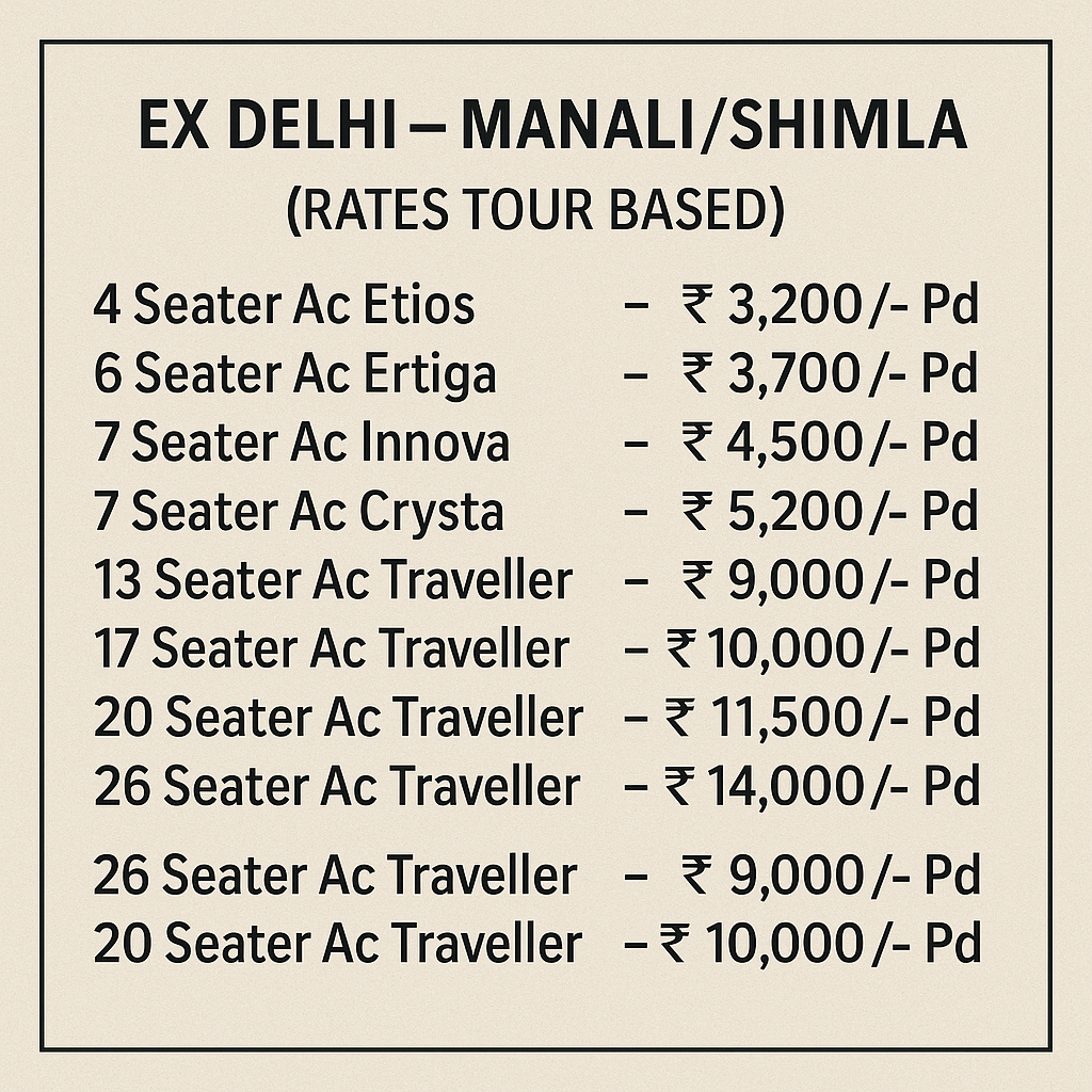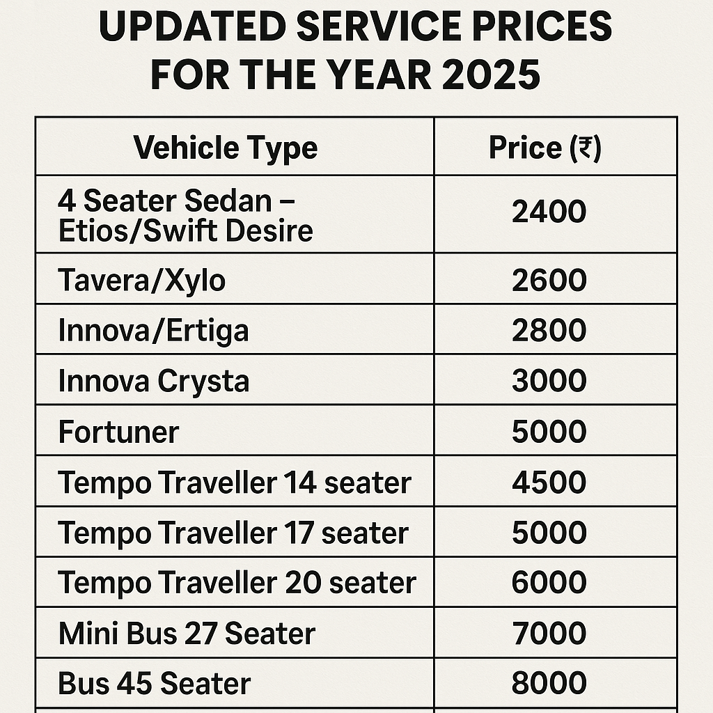 Sedan ✔ Hatchback ✔ Ertiga ✔ Innova Crysta ✔ 12–24 Seater Tempo Travellers ✔ 07–16 Seater Urbania Luxury Vans ✔ 27–55 Seater AC Buses
